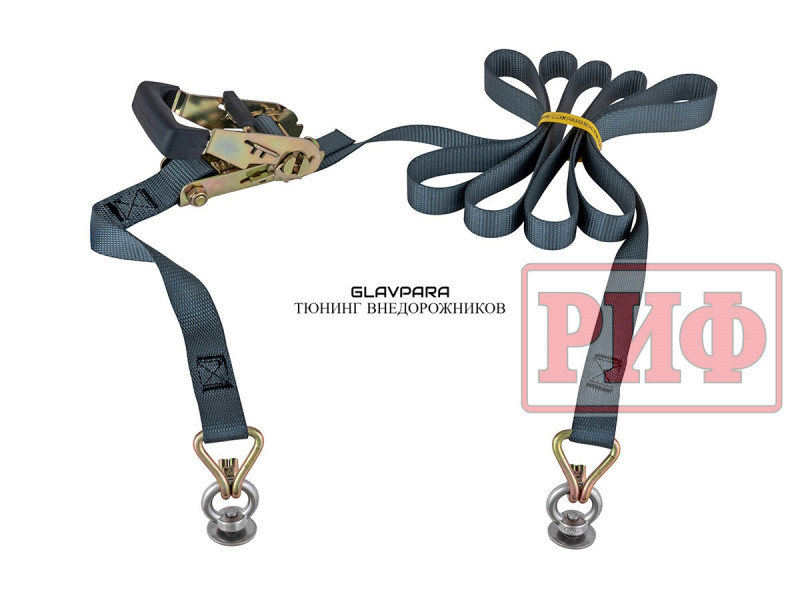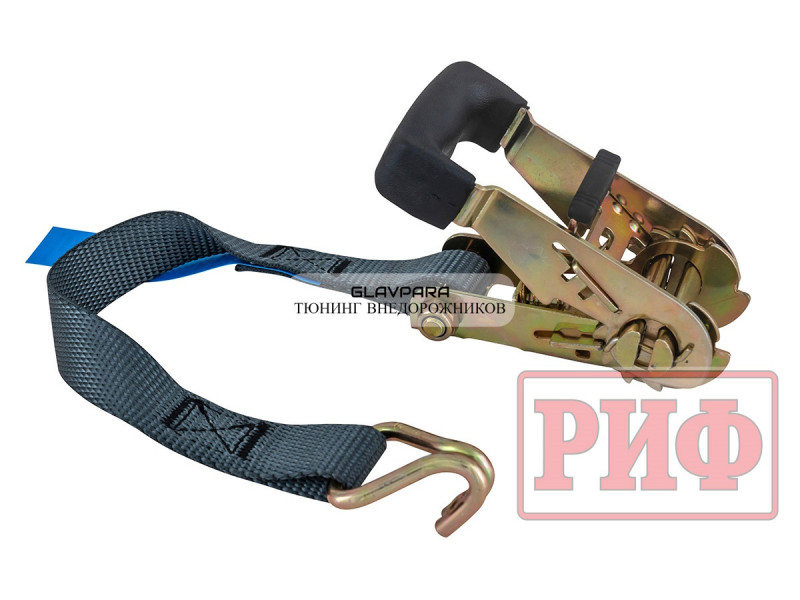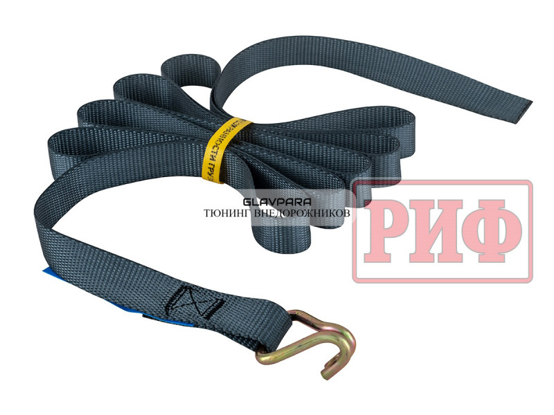 Ремень крепежный стяжной для багажной системы РИФ имеет длину 3000 мм, ширину 25 мм, прочность на разрыв 1500 кг.
