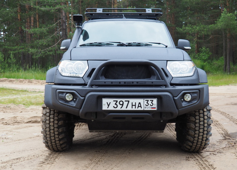 - Передний композитный усиленный бампер с площадкой под лебедку и светодиодными противотуманными фарами: 1шт