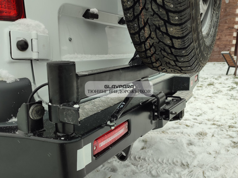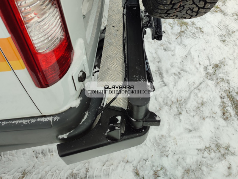 Надежная калитка выдержит самое большое запасное колесо. Надежный фиксатор калитки удержит ее в закрытом состоянии на любой пересеченной местности, особо жесткая конструкция калитки рассчитана на тяжелую запаску большого размера.