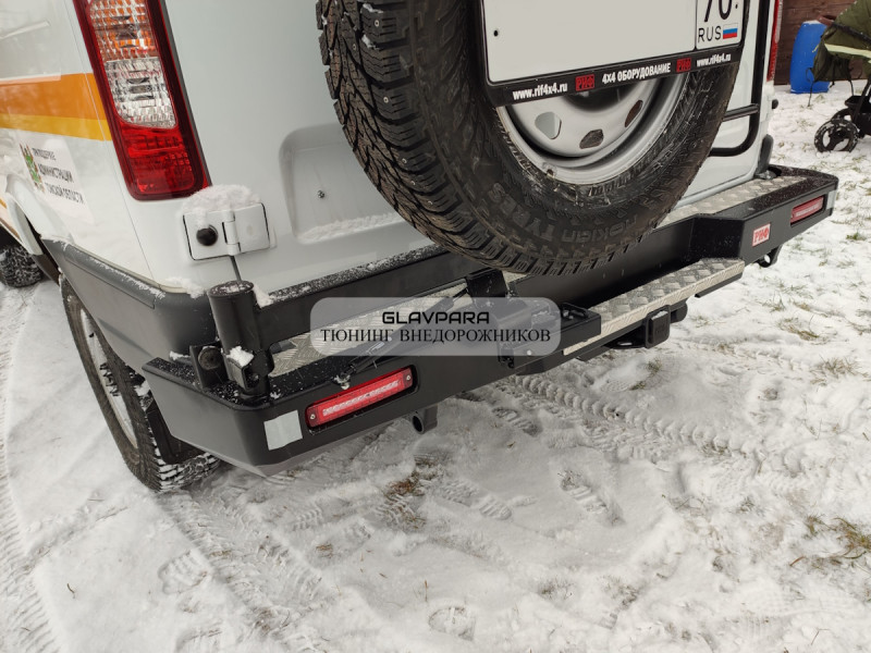 Бампер РИФ силовой задний ГАЗ Соболь с квадратом под фаркоп, калиткой (слева), фонарями, подсветкой номера, стандарт