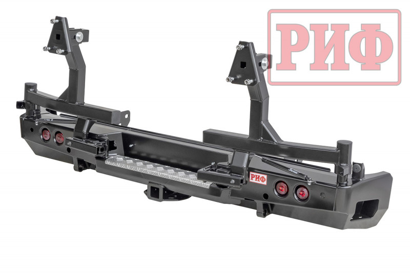 Благодаря тщательно просчитанной конструкции, которая обеспечивает высокие прочность и жесткость изделия, на заднем бампере РИФ для Toyota Land Cruiser 105 возможна перевозка двух колес большого диаметра на калитках. Сами калитки поставляются в комплекте, все монтажные отверстия уже предусмотрены и выполнены в корпусе бампера. Таким образом, можно скомплектовать бампер «под себя». Если нет нужды перемещать запаску на калитку, то бампер покупается без калиток, если достаточно одного запасного колеса на бампере, то калитка ставится одна. В случае установки двух запасок максимально возможный их диаметр – 33 дюйма.