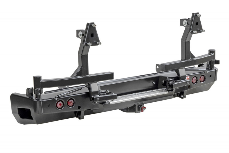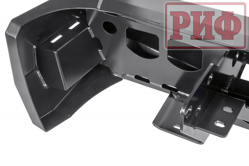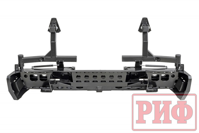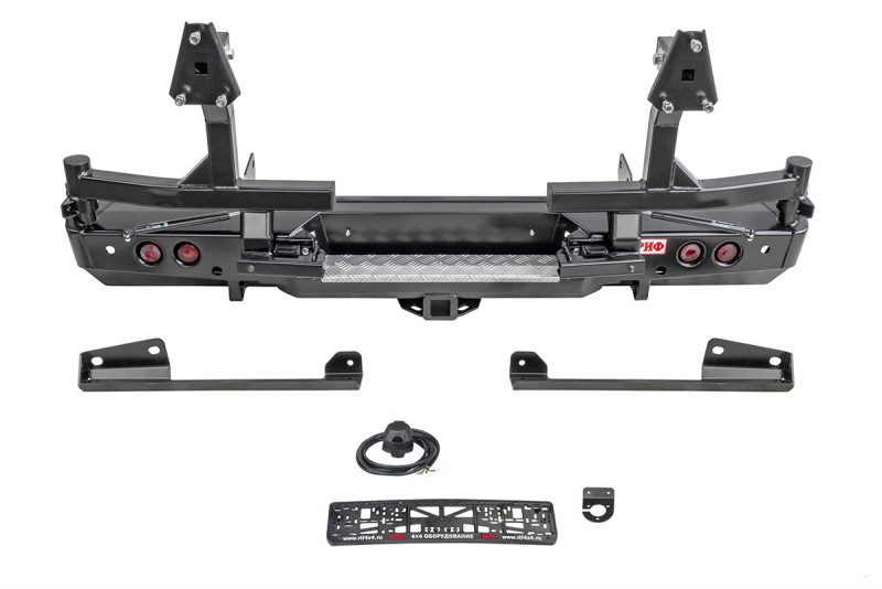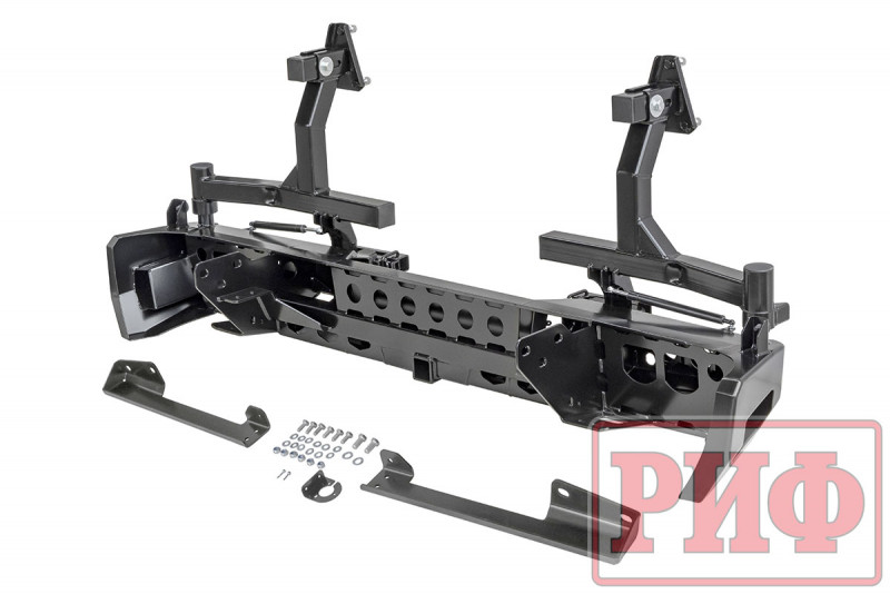 В нижней части бампера располагается интегрированный в корпус «квадрат» стандарта 2”, который может использоваться для крепления фаркопа, площадки-ступеньки, буксировочной проушины, площадки под переносную лебедку и пр. Предусмотрены две мощные буксировочные проушины и вырезы для размещения дублирующих сигнальных фонарей (основные могут перекрываться запасными колесами большого диаметра).