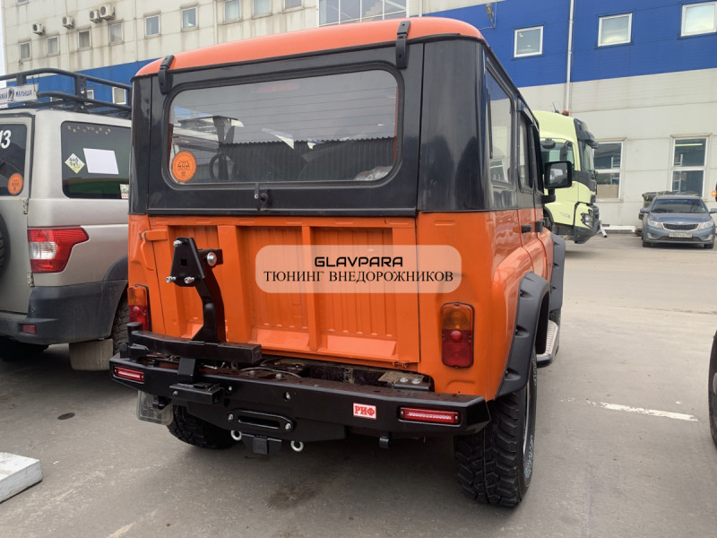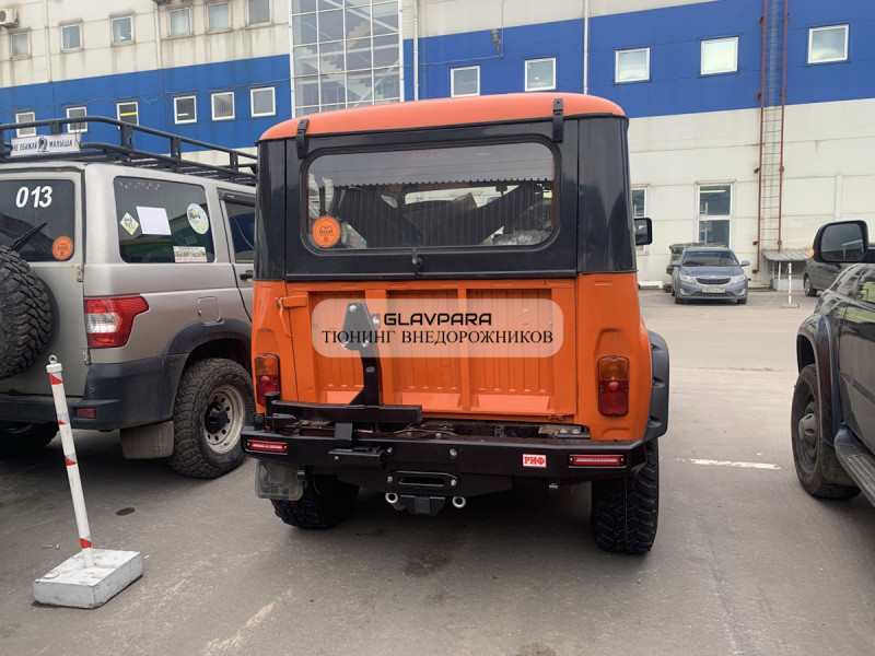 Бампер РИФ силовой задний УАЗ Хантер с площадкой под лебедку, калиткой, фонарями, подсветкой номера стандарт