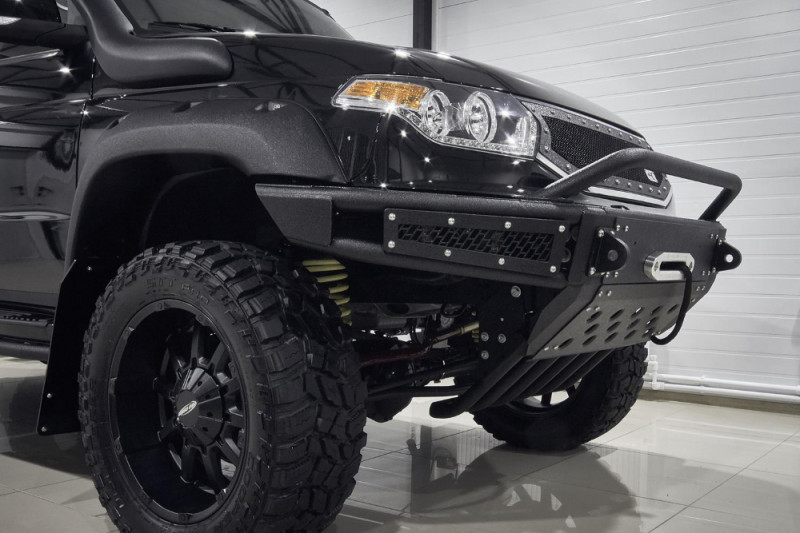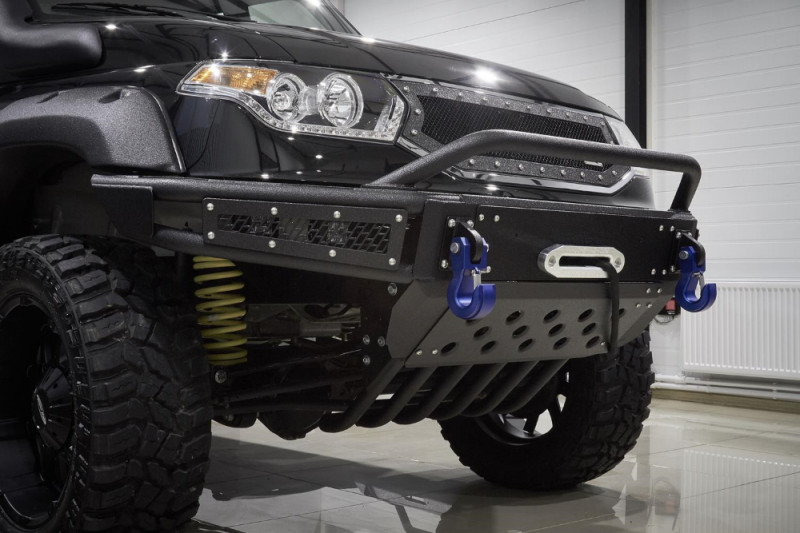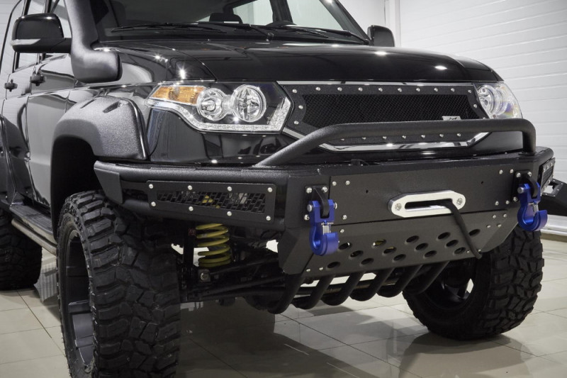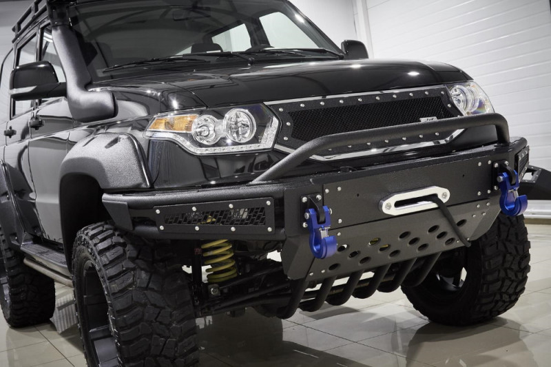 УАЗ Патриот создан для бездорожья, а вот его штатные бамперы подходят только для города. Силовой обвес – неотъемлемый атрибут внедорожника, такой же как лебёдка, специальная грязевая резина и колёса большого диаметра, вместе с которыми обычно устанавливают расширители колёсных арок. Силовой бампер для УАЗ Патриот, представленный в каталоге артикулом BMS060113, разработан специально для установки вместе с расширителями Lapter. Он крепится прямо к раме и прекрасно справляется с нагрузкой при буксировке, работе с лебёдкой или домкратом. Кстати, конструкция позволяет интегрировать в бампер лебёдку с синтетическим тросом и тяговым усилием до 5,5 тонн. Имеются посадочные места и для противотуманных фар, их защищают стальные решётки с узнаваемой текстурой BMS.