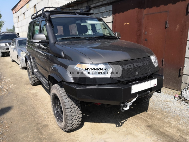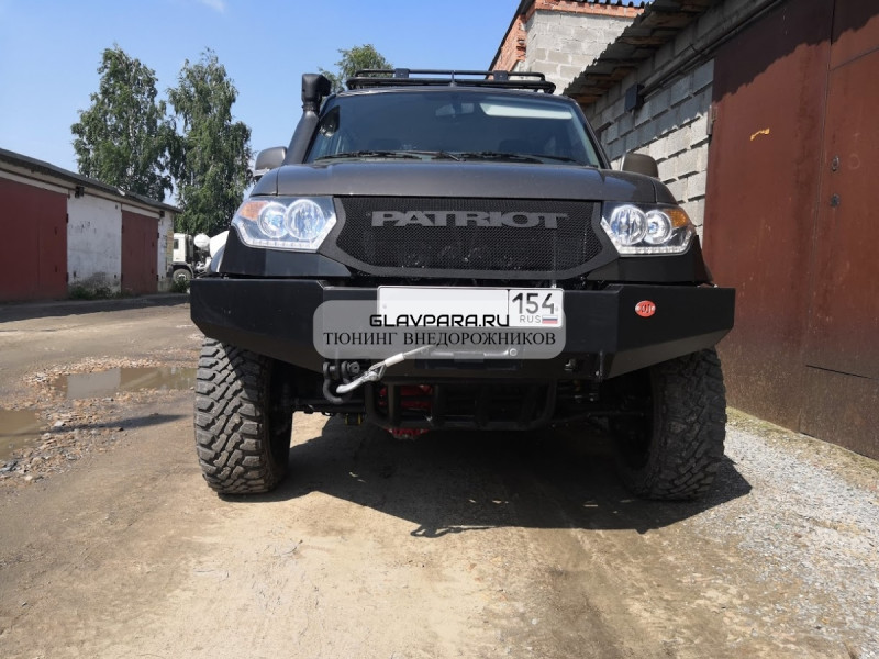 Бампер комплектуется накладками кузова, позволяющими установить его на рестайлинговый Патриот 2014 без подрезки штатного бампера.