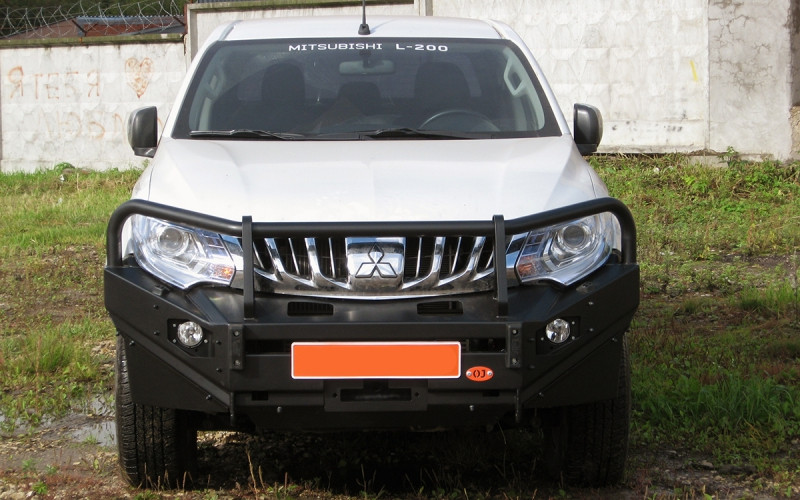 Передний силовой бампер OJ серии Трофи для Митсубиси Л200 2015+ с защитными дугами, вертикальной площадкой лебёдки, проёмами под штатные ПТФ с заглушками, буксирными проушинами, упорами для реечного домкрата, боковыми защитными кожухами, резиновыми буферами.